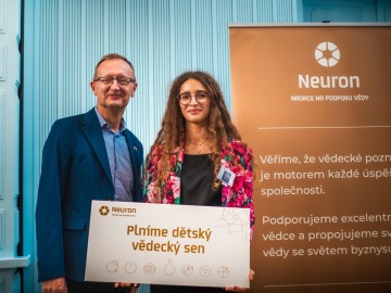 Jaroslav Řasa, zakladatel a mecenáš Nadace Neuron, předal Terezii Štěpánkové šek na splnění vědeckého snu